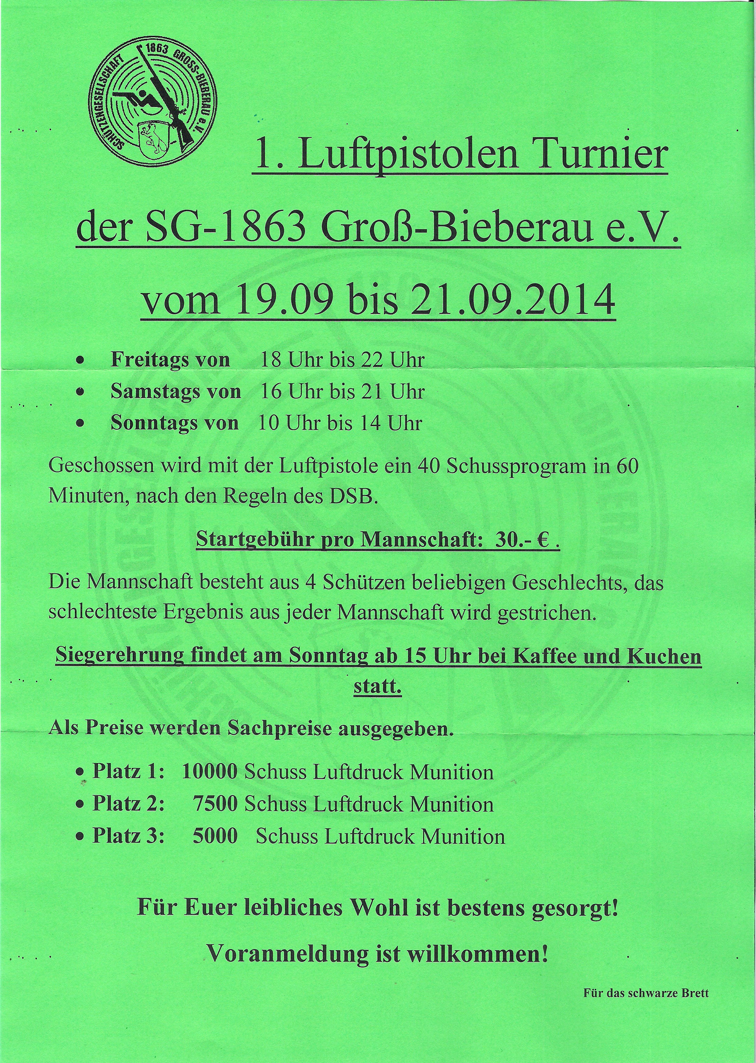Einladung zum 1. Luftpistolen Turnier der SG 1863 Groß-Bieberau 19. - 21.09.2014